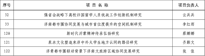 近日,济南市哲学社会科学工作办公室公布了2026年度济南市哲学社会科学规划研究项目立项名单,校区共有5项课题获批立项,其中云兵兵、李红雨获批重点项目,蔡娜娜、齐斯文、张佳获批一般项目。