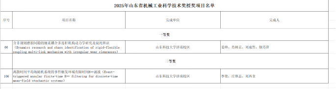 近日,山东省机械工业科学技术协会公布了2025年度山东省机械工业科学技术奖授奖项目名单。校区教师喜获一等奖、二等奖各一项。其中,姜帅副教授的科研成果“含非规则磨损间隙的刚柔耦合多连杆机构动力学研究及混沌辨识”荣获一等奖;李艳教授的科研成果“离散时间平均场随机系统的事件触发环域有限时间H∞滤波”荣获二等奖。